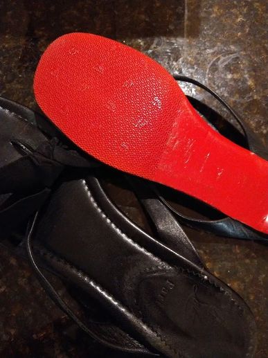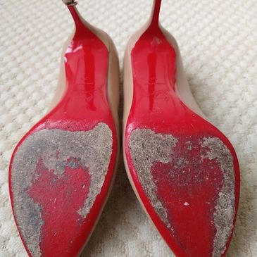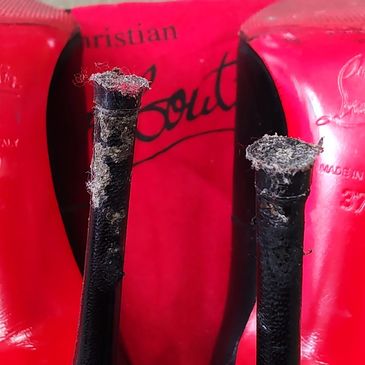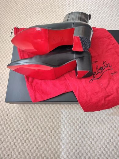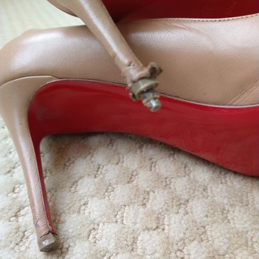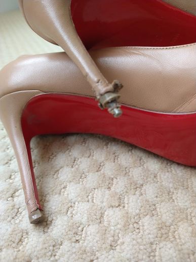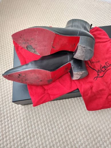 These Louboutin boots were worn through their protective sole guard, right down to the leather sole. The distinctive red heels were torn completely off.